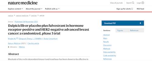 11月4日,国际四大医学期刊之一、英国《自然》旗下《自然医学》(Nature Medicine)在线发表CDK4/6抑制剂达尔西利(SHR6390)联合氟维司群治疗既往内分泌治疗后疾病进展的HR+/HER2-晚期乳腺癌的多中心、随机、双盲III期临床研究(DAWNA-1研究)中期分析结果报告,首次对氟维司群(雌激素受体降解剂)±达尔西利治疗激素受体阳性晚期乳腺癌的有效性和安全性进行了比较。研究结果显示,达尔西利+氟维司群组与安慰剂+氟维司群组相比,无进展生存期(PFS)显著延长。该项研究由中国医学科学院肿瘤医院徐兵河教授担任leading PI,全国39家医院参研,由AG真人医药临床研发团队支持完成。