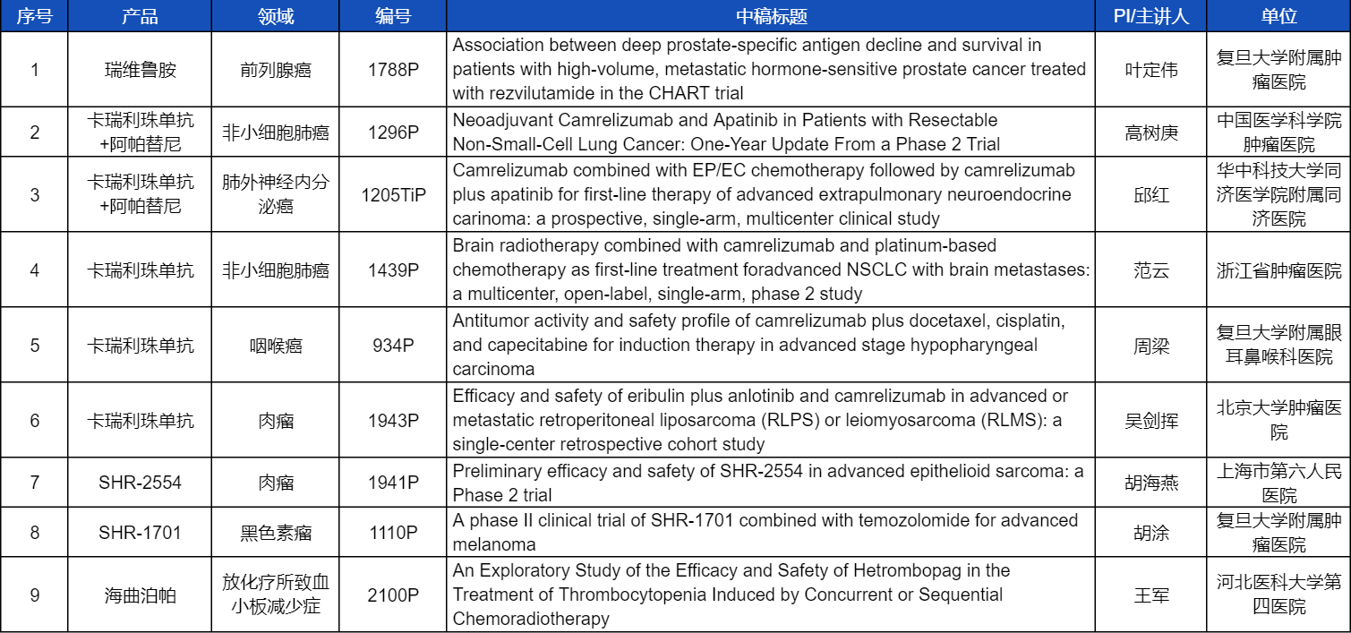 在非小细胞肺癌、咽喉癌、肉瘤、前列腺癌、黑色素瘤等多个领域,卡瑞利珠单抗、阿帕替尼、瑞维鲁胺、SHR-1701、SHR2554等创新产品相关研究一共入选了8项壁报展示。此外,AG真人医药自主研发的血小板生成素受体激动剂(TPO-RA)海曲泊帕在放化疗所致血小板减少领域的探索性研究显示良好的疗效,入选壁报展示。